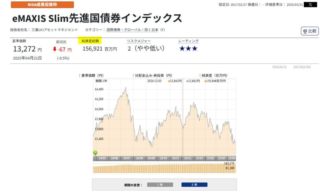 ②の純資産総額の大きさは、その商品の規模を表しています。