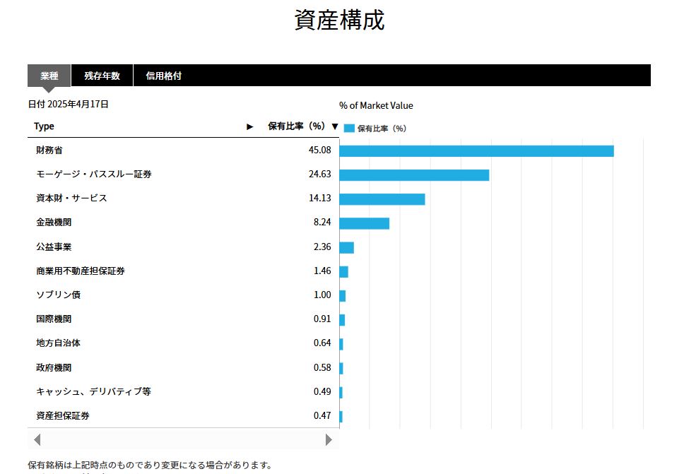 こちらはアメリカ政府系に投資をしたりと、潰れる心配が限りなく0に近いので、この1銘柄で優良なアメリカの国債に投資ができるというイメージです。