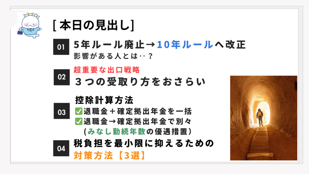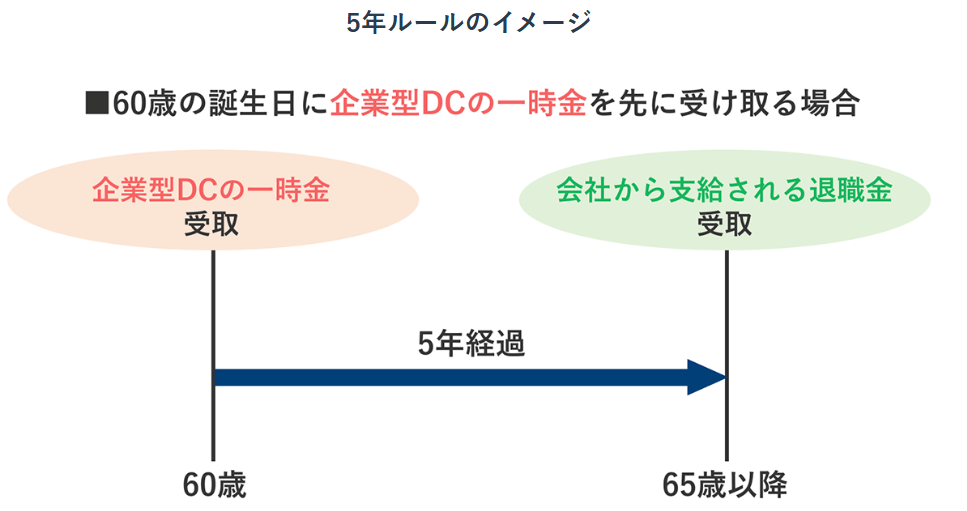 そもそも5年ルールとは、企業型DCあるいはiDeCoを先に受け取って5年間空ければ、退職金を受け取る際にも控除を使えて税金を抑えられるというルールでした。