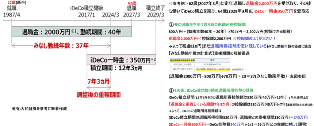 メリット: iDeCoで積立を行うことで、1年間で40万円の退職所得控除枠を増やすことができます。