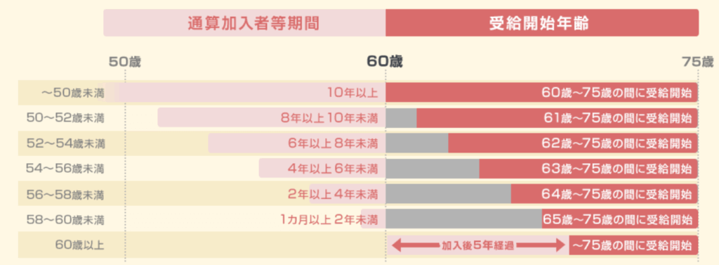 受給時期: 60歳でiDeCoに加入した場合、最短で5年後の65歳から受給可能です。