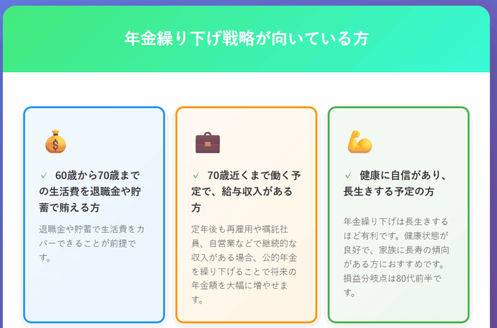 メリット: iDeCoと違って公的年金は終身なので、少しでも繰り下げることで、この先ずっと増額された年金を受け取り続けられます。