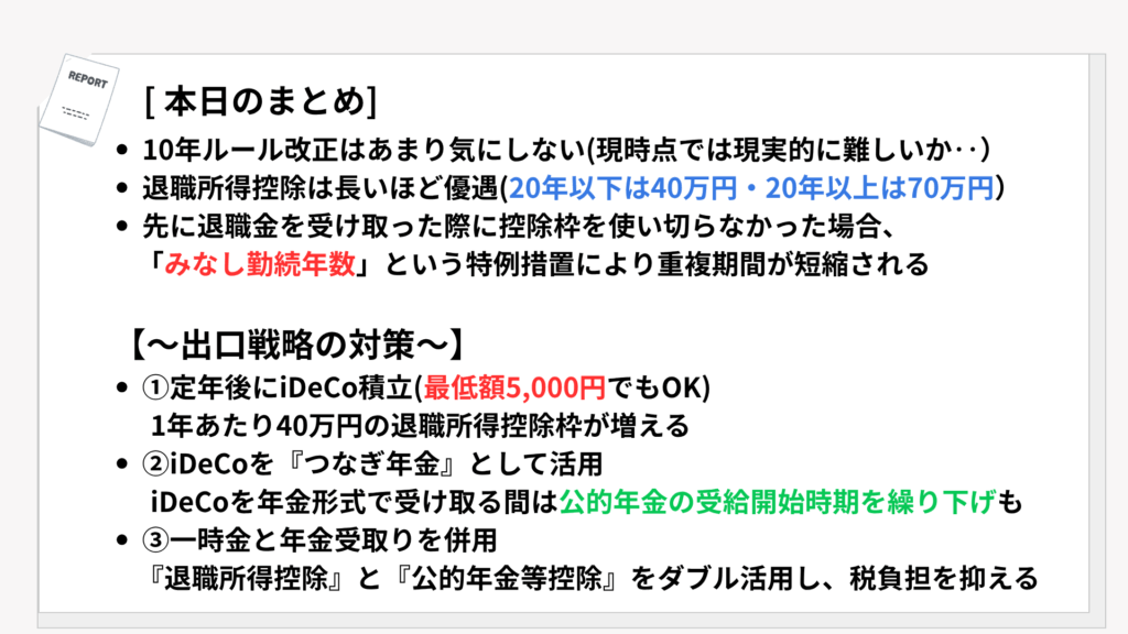 つまり、iDeCoと退職金を別々に受け取る際にそれぞれで退職所得控除をフル活用するという抜け道は、実質的に塞がれたとも解釈できます。