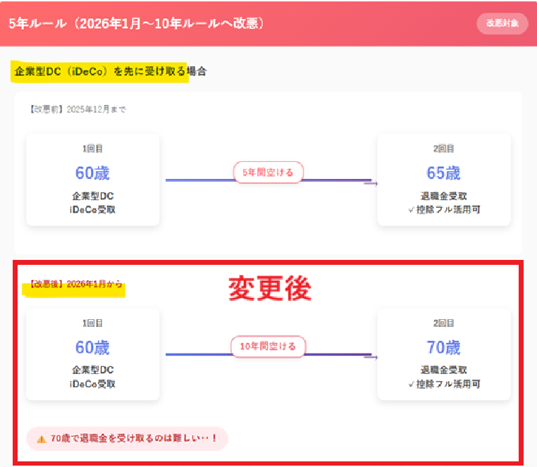 見直し後は、60歳で企業型DCを受け取って、70歳で退職金を受け取ることになるため、10年空けることが必要になります。これは現実的ではありません。