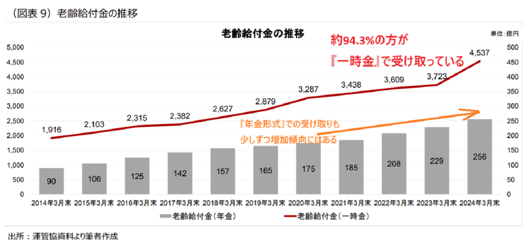 運用管理機関の資料によると、企業型DCやiDeCoを一時金で受け取っている方は全体の94.3%と、大半の方が一時金での受け取りを選んでいます。